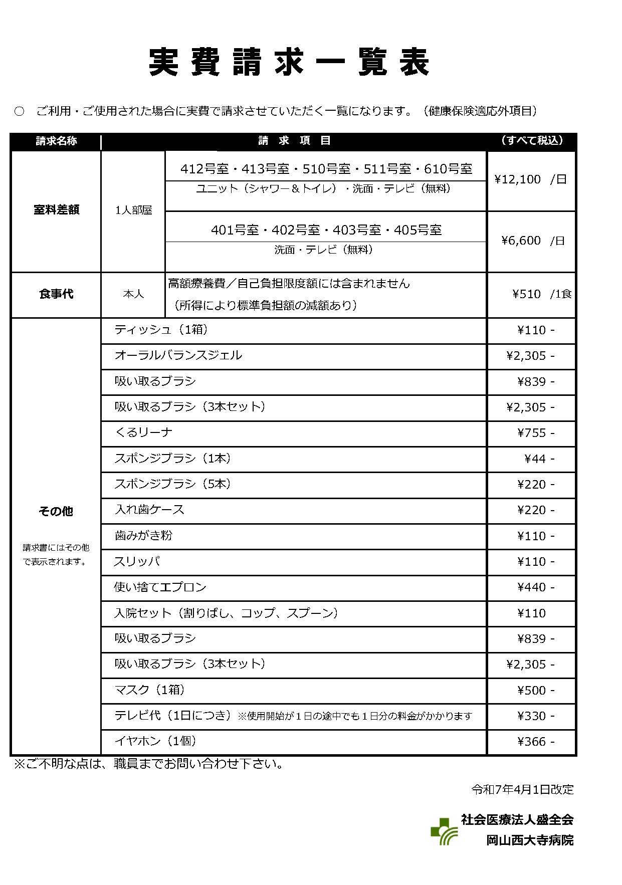 当院では、差額病床使用料、診断書、紙おしめ、その他(別掲示)実費の負担をお願いしています。