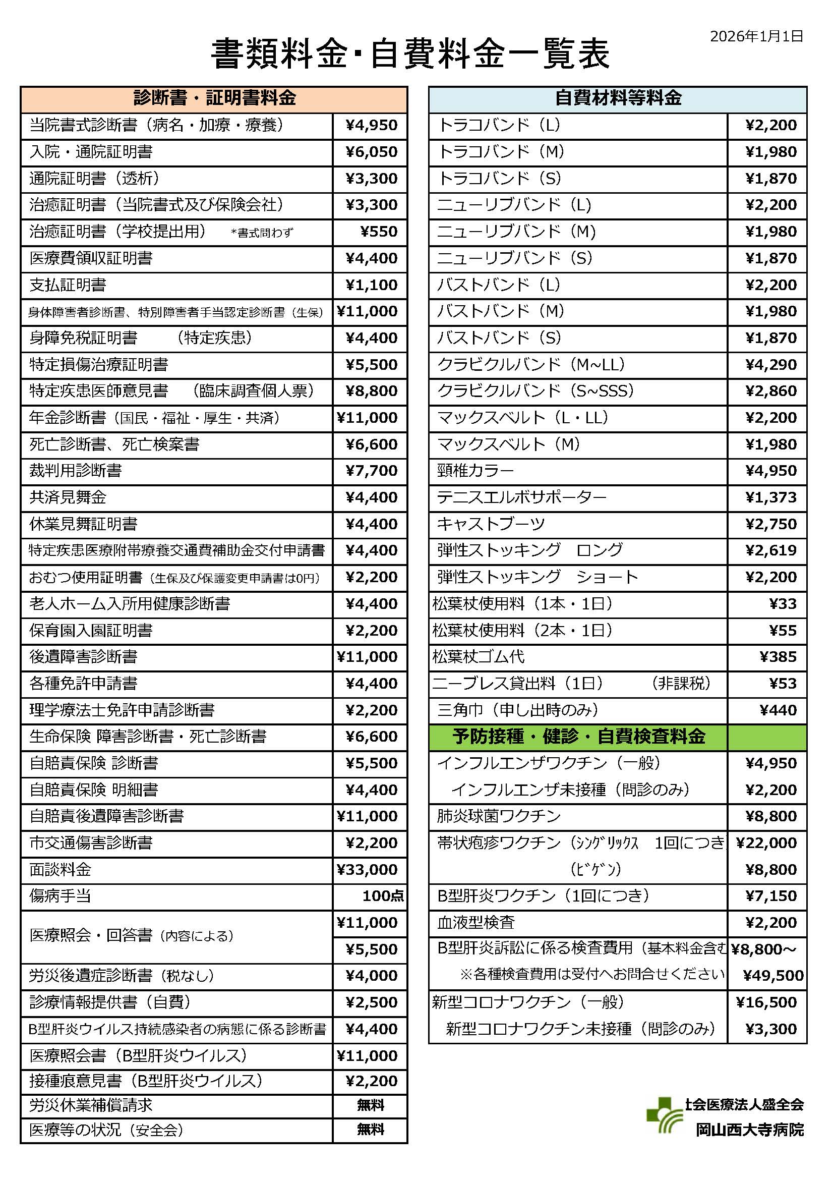 種類料金・自費料金一覧表