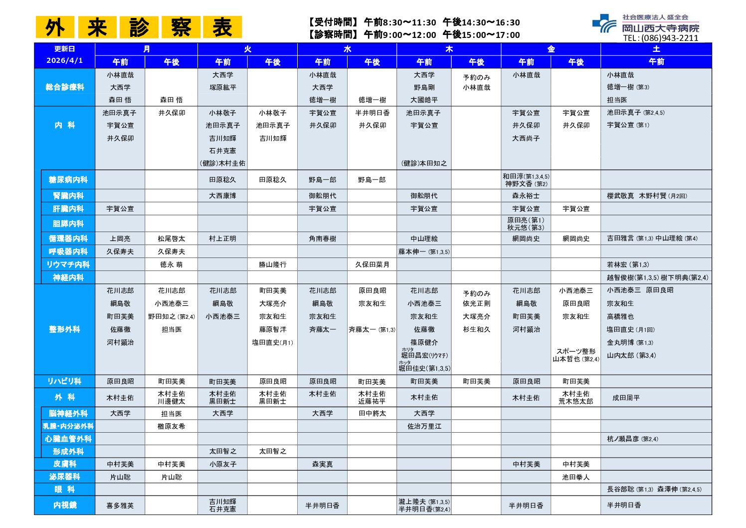 2026.4.1 更新 ※診療体制は変更する場合がございますので、事前に確認のうえでご来院ください(ただし緊急時を除く)。 拡大図はこちらからご確認いただけます。